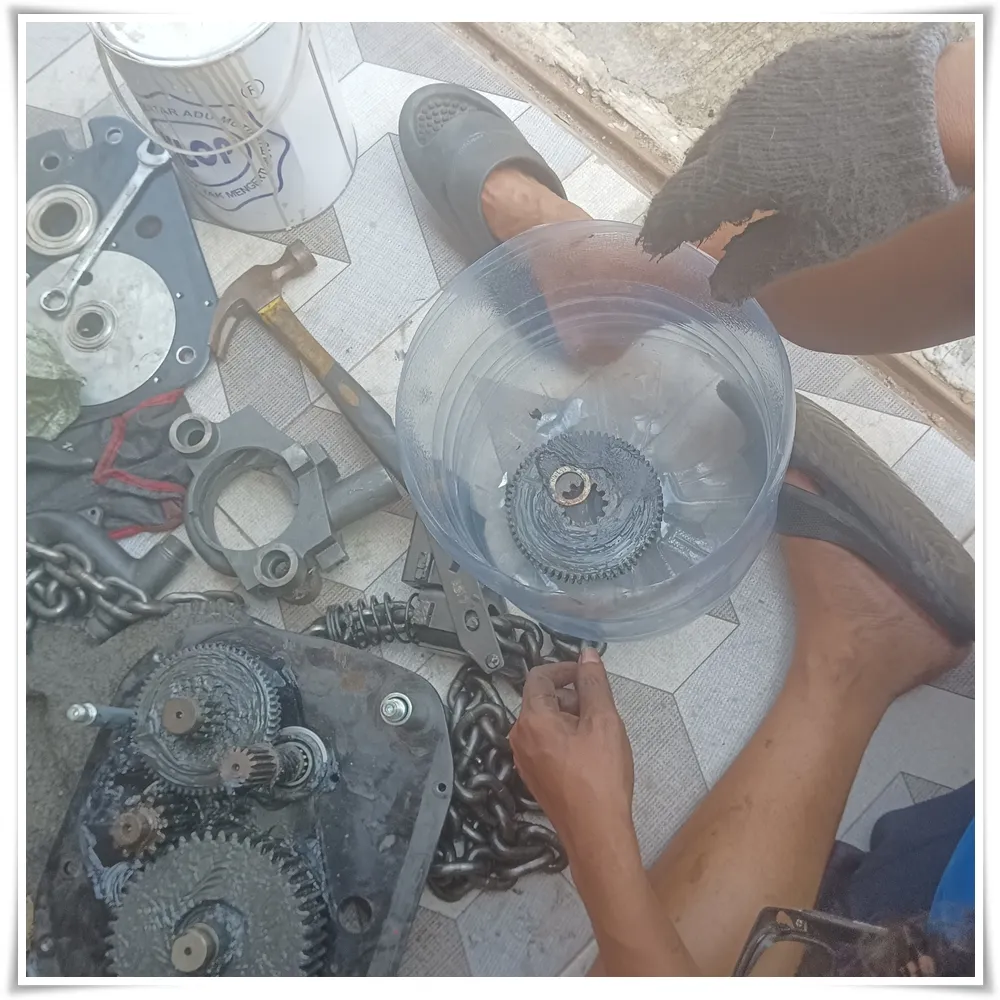 - Brake assy, sprocket, chain hoist 8 mm, kopling, gear train, panel kontrol (kontak bantu, relay/PLC), MCB/thermal, contactor, limit switch, kabel sling & bandul (counterweight).