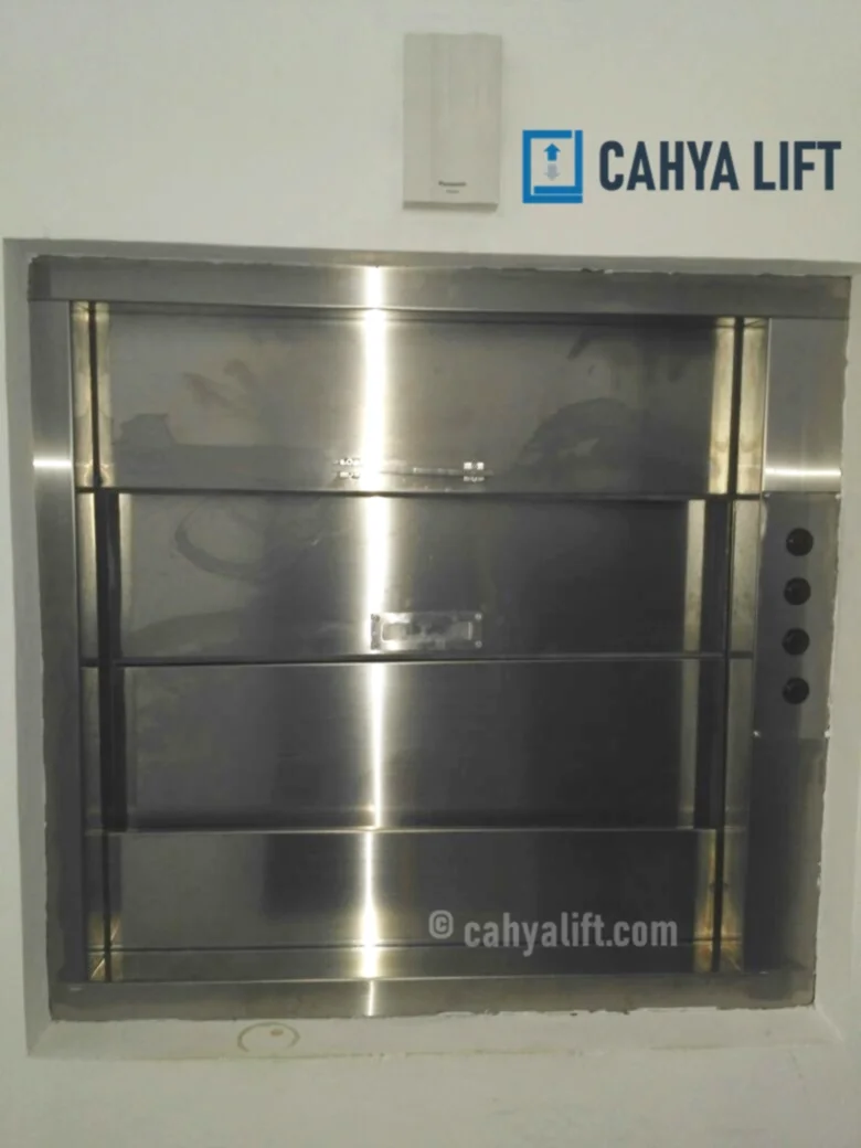 Lift makanan 75 kg untuk restoran kecil: hemat listrik (220V/380V), kabin compact, interlock & sensor overload, instalasi 2–4 minggu. Custom dimensi & finishing. Garansi & perawatan oleh Cahya Lift.